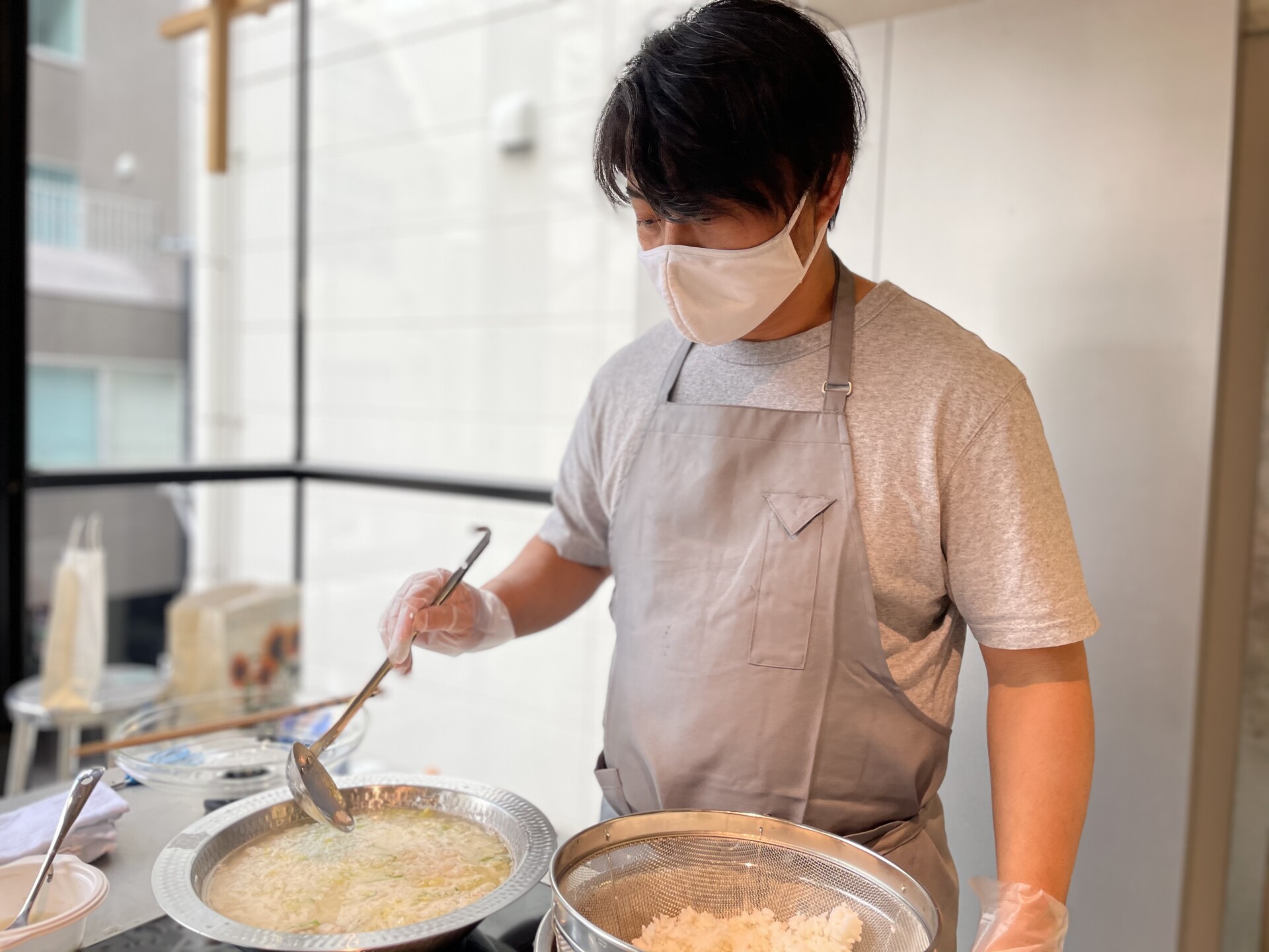 グループトーク中に『dot.』のキッチンスペースにて、大分市中心部で人気のダイニングバー・バル『A BAR NANDO』のオーナー、安達了剛(あだちとしたか)さんが調理した、できたてのふぐ雑炊を召し上がっていただきました。ふぐ雑炊の上品な香りとさっぱりとした味わいに参加者もほっこりしたご様子。