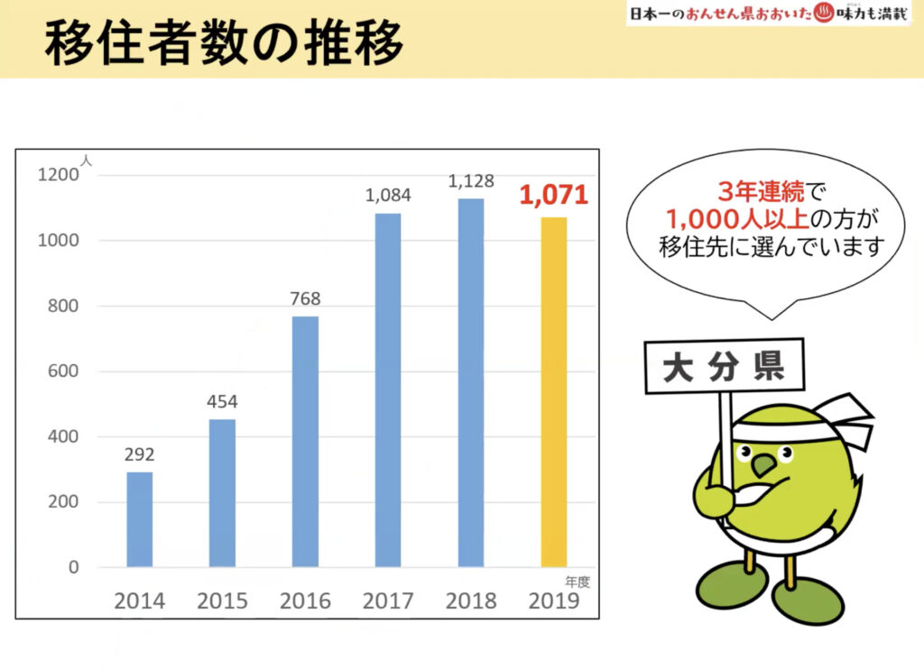 県の移住担当者が、大分県の気候や温泉などの基本情報をはじめ、移住にまつわる最新情報について説明するとこからスタートしました。大分県への移住者は近年増加傾向にあり、3年連続1,000人以上の方が移住先として大分県を選んでいます。また、宝島社より発刊される情報誌「田舎暮らしの本」では、前年度に引き続き「移住したい都道府県ランキング」で8位に位置するなど、全国的にも人気の地域になっています。