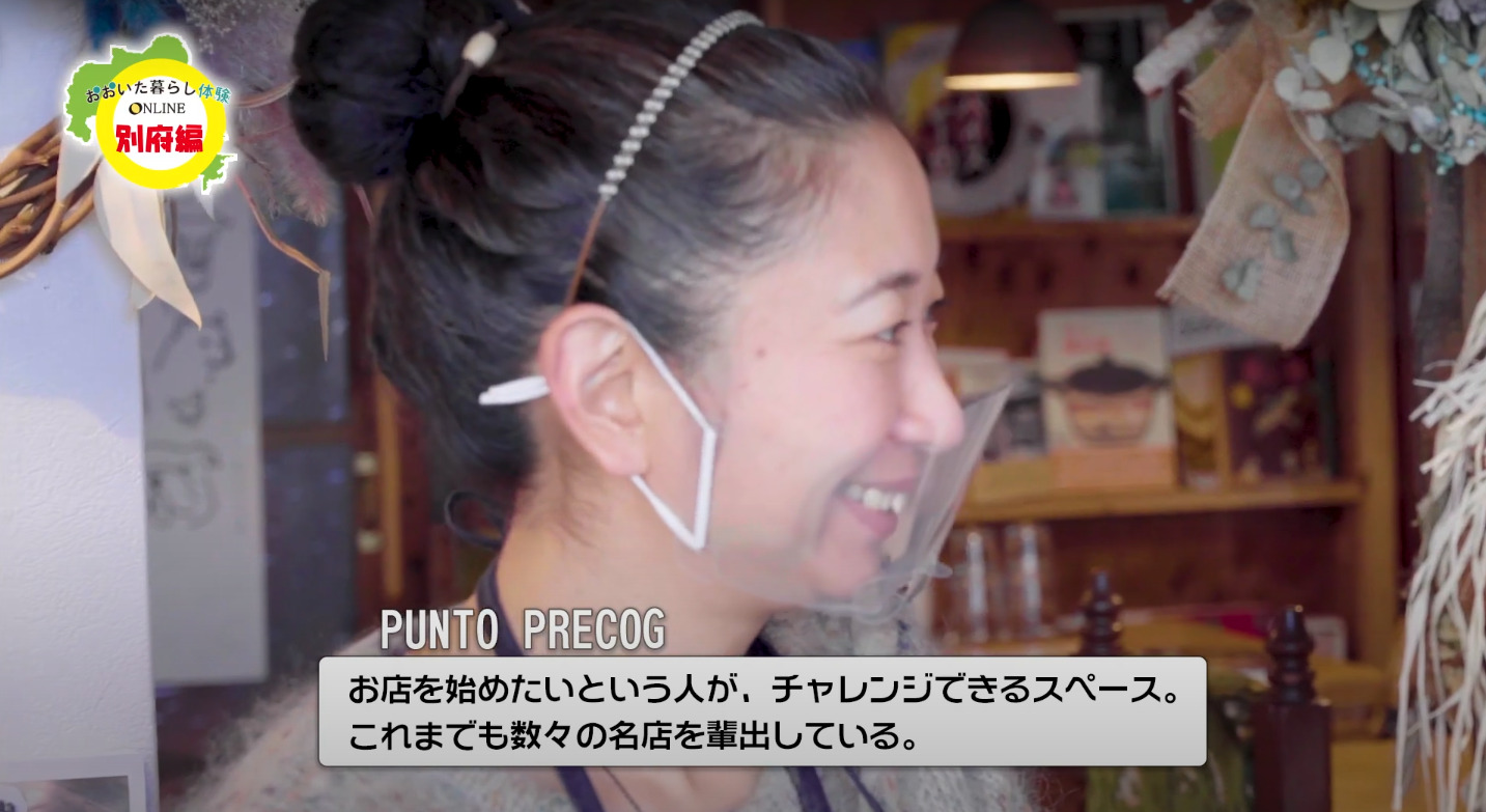その他、パワースポットと名高い朝見神社がある「朝見エリア」や、別府一の繁華街である「北浜エリア」を巡り、県外から移住してアーティスト活動をする方や、チャレンジショップ「PUNTO PRECOG(プントプレコグ)」を利用してお店を開業された方々を紹介。「一歩踏み出して、まず飛び込んでほしい」と移住を考える人の背中を押してくれる一コマも。別府市に移住したきっかけや経緯、やりたいことにチャレンジできる環境の魅力を語ってくれました。