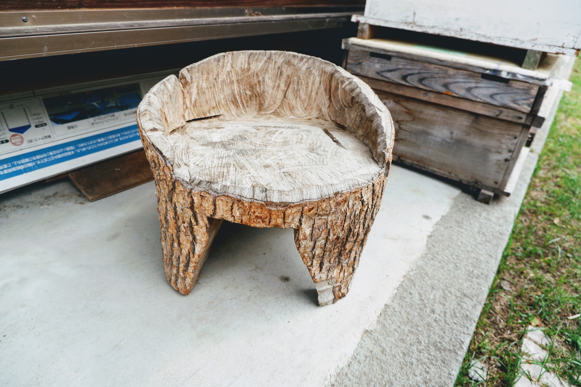 自伐型林業で学んだチェーンソーで作ったクスノキのイス。