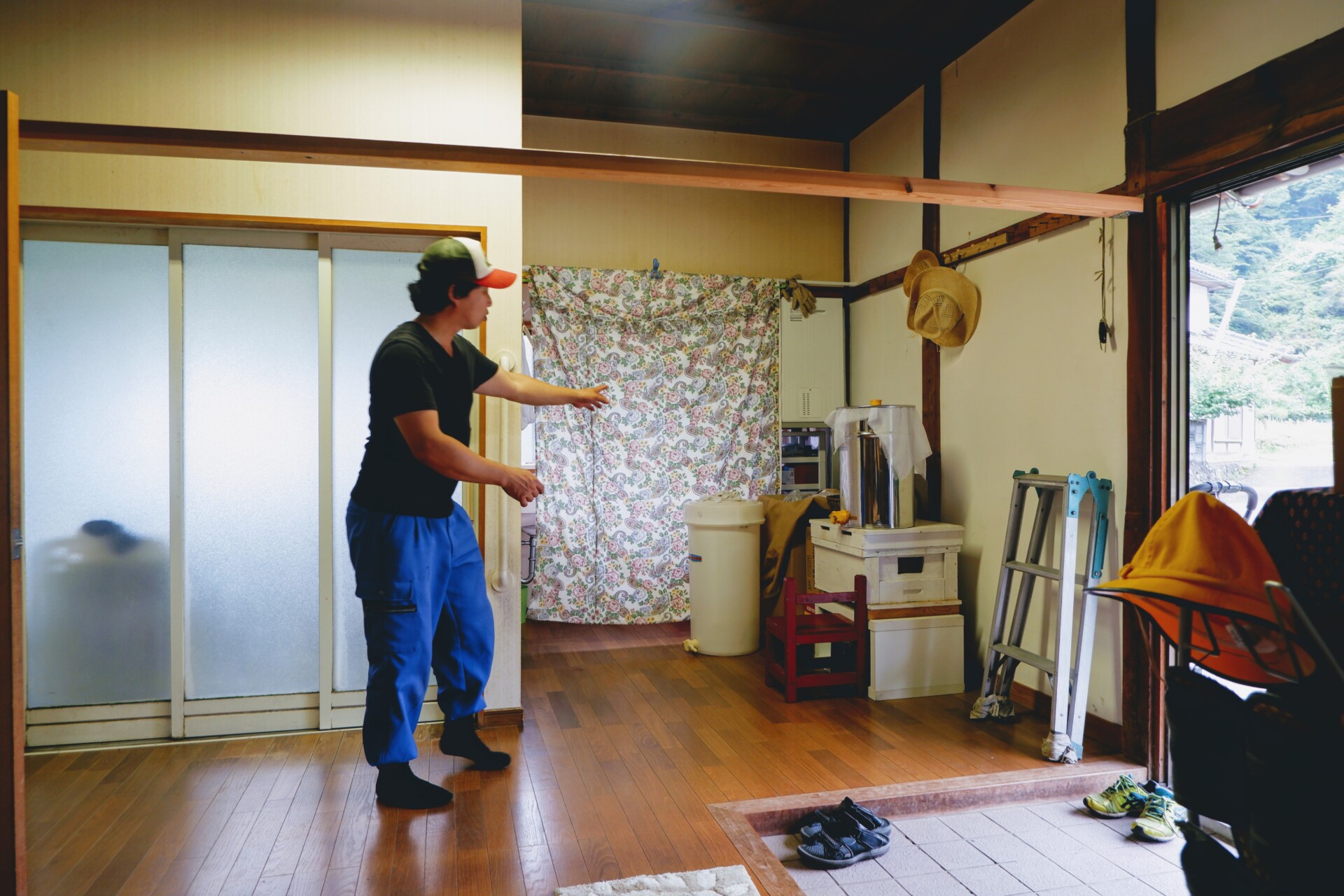福岡県出身の竪山さんは元自衛隊員です。中津市本耶馬溪町へ移住し、養蜂家になりました。竪山さんは空き家バンクを活用して家を見つけ、2021年11月現在移住4年目になります。竪山さんが暮らす集落には80名ほどが住んでいます。夏には近くの川など、自然豊かな環境で子どもたちが思う存分遊ぶことができ、とても気に入っているそうです。家族5人で暮らす空き家を見つけた経緯と、家の改修についてお聞きしました。