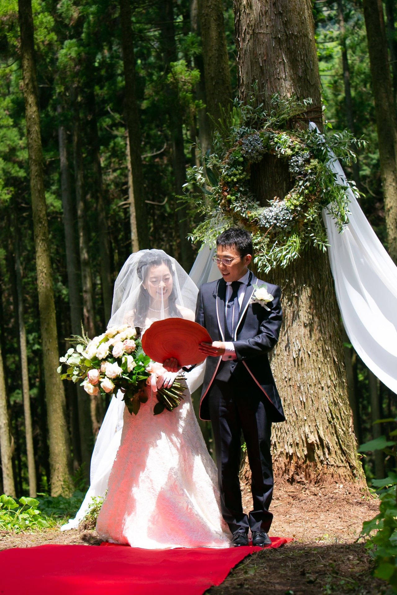 家族総出で山々を案内していただく中で一番思い出に残ったのが「木漏れ日の森」。「ここで結婚式をしたい!」と思ったそうで、ご縁もあり、山の日に入籍、後の2019年5月に素敵な森の結婚式を開催されました。