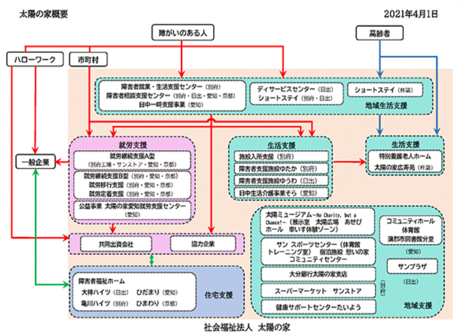 太陽の家では、障がいのため、一般の事業所に雇用されることが困難な方に、就労の場を提供する就労継続事業を行っており、作業訓練や社会参加を促すことでいずれ一般企業や共同出資会社への就職を目指す人もいます。その他にも、生活支援のための入所施設や福祉ホーム、就労から生活まで困ったこと全てを相談できる支援センターもあります。また、太陽ミュージアムやスポーツセンター、コミュニティセンター等を通じて地域交流も盛んです。