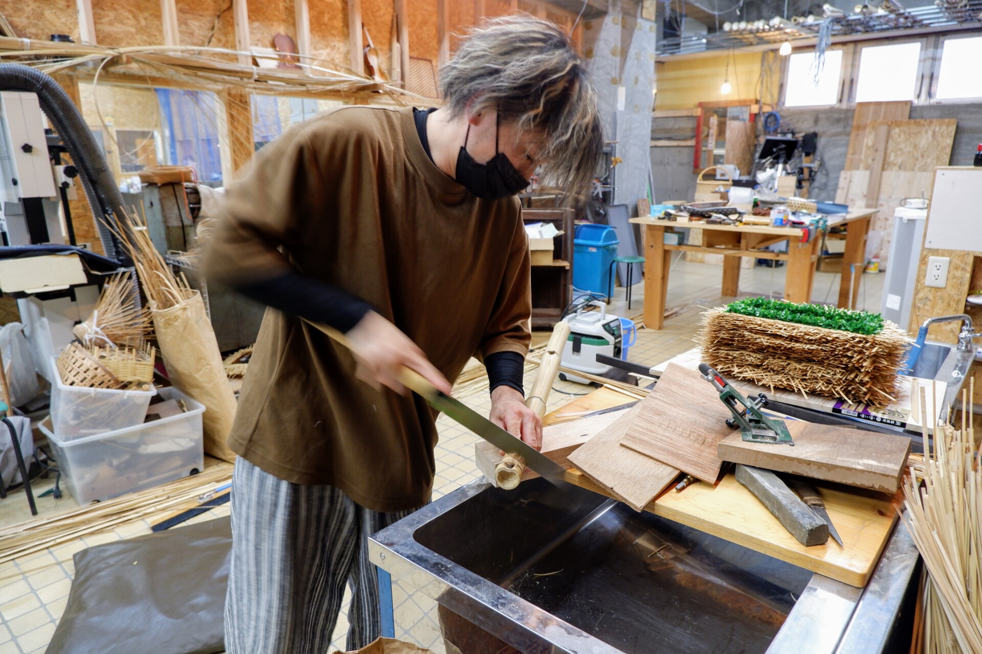 ちから:ここにあるのは僕の所有している工作機械です。様々なジャンルがあるので一部はものづくりをする方々へお貸ししています。現在はこのスペースの経営もしていて、株式会社synergiezとして法人化しました。個人の仕事では小さな竹細工から、竹を利用した楽器、公園やビルの空間演出などの大きな作品までデザイン・制作します。一般的な竹工芸だけでは今後需要を獲得するのはなかなか難しいかもしれません。竹工芸を軸にしていろんなことに挑戦してみるといいと思います。synergiezでは、竹工芸だけでなく、さまざまなものづくりの方が集まれるようにしました。吹き付け作業や3Dプリンター、レーザー加工による彫刻や切断、ミシン作業に至るまでなんでもできます。この中で竹との触れ合いを増やして、需要を作っていきたいと考えています。開業時期がコロナ禍と重なり、PRもままなりませんでしたが、この1年半で現在数社の企業が利用してくれていて、個人も数名通っています。
