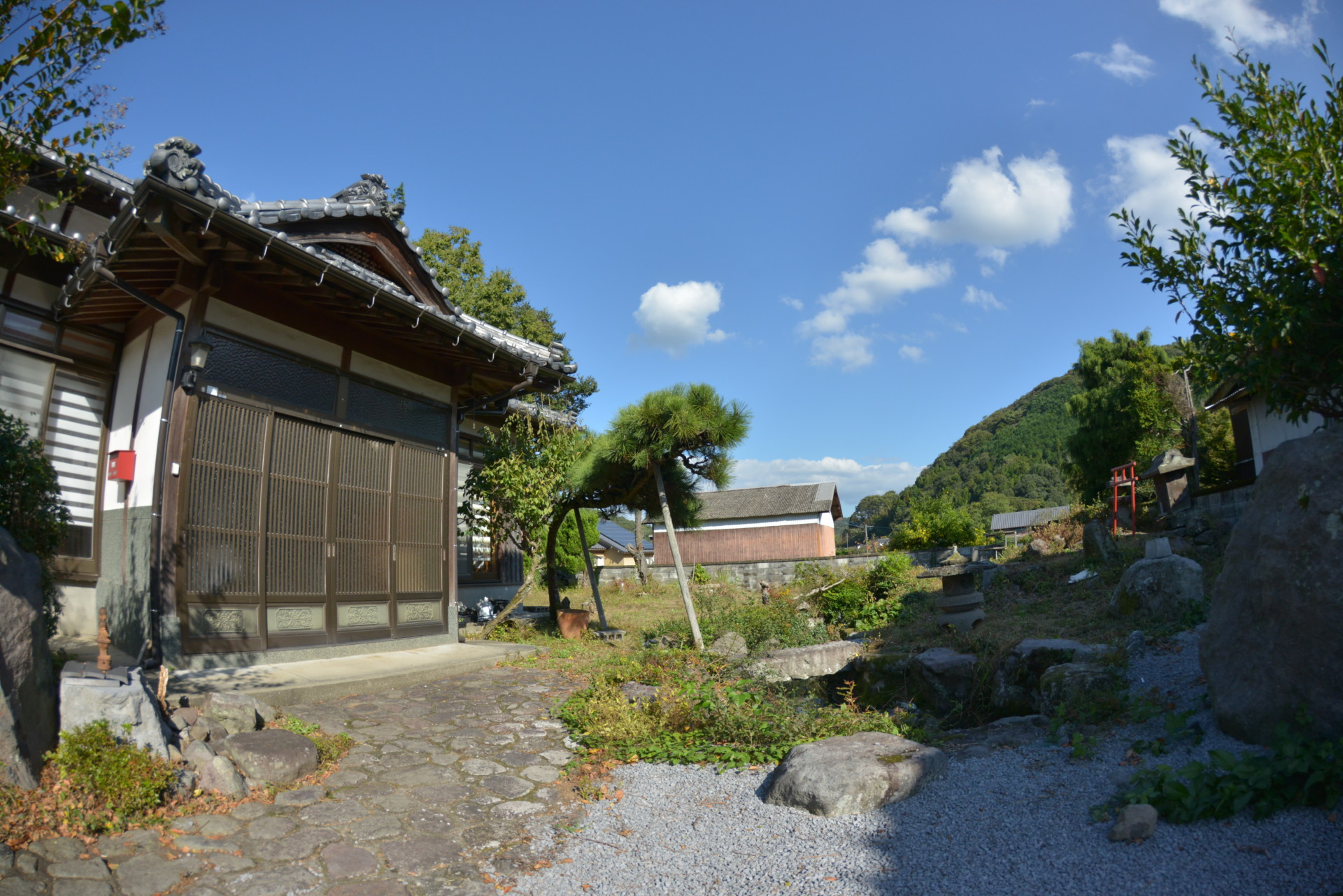 清成さんのご自宅の玄関先。庭には池や鳥居もある。