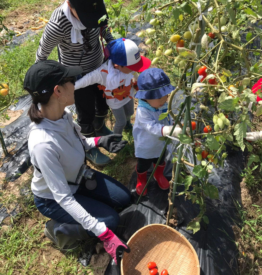 東京から遊びにきた友人の家族と共に野菜の収穫