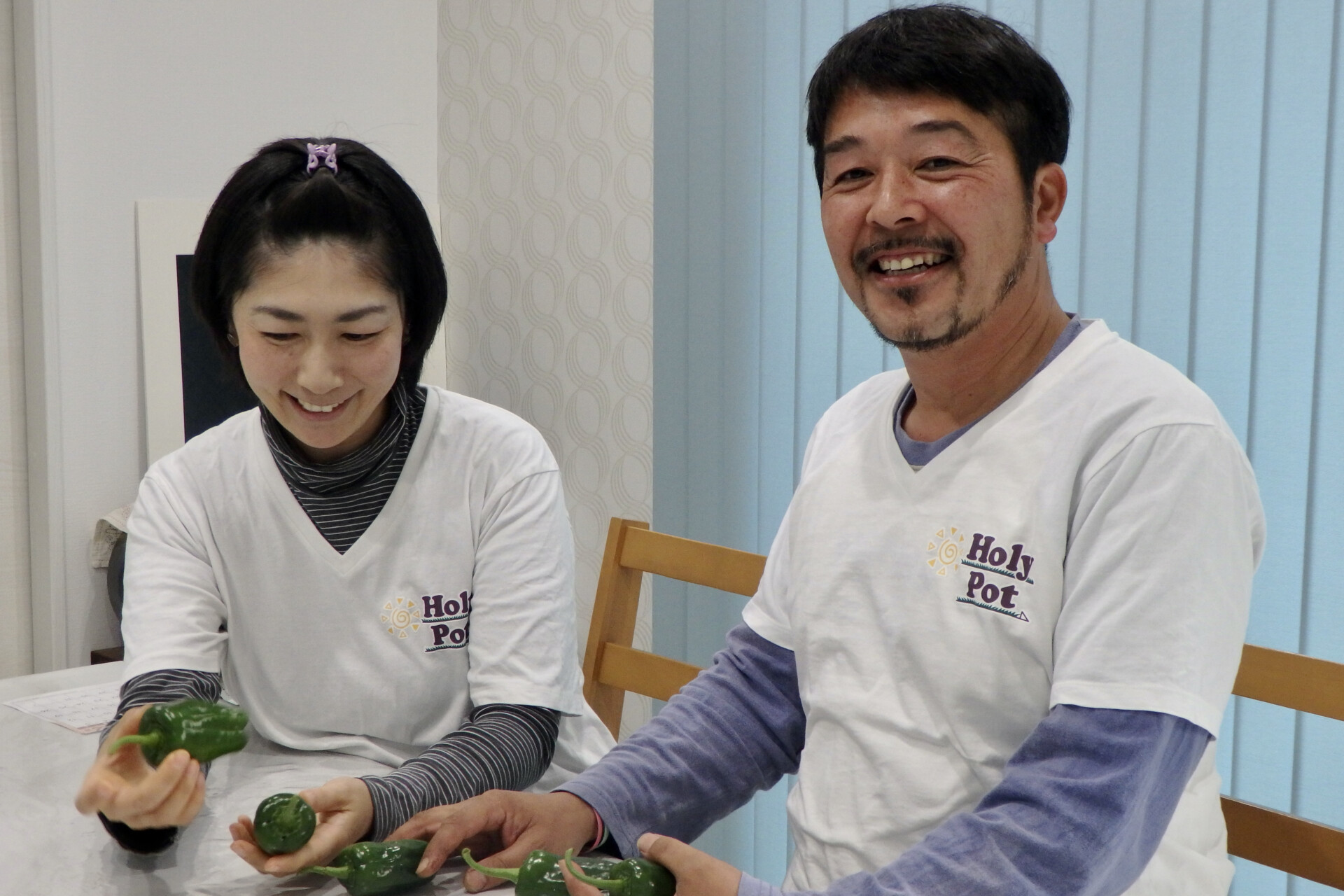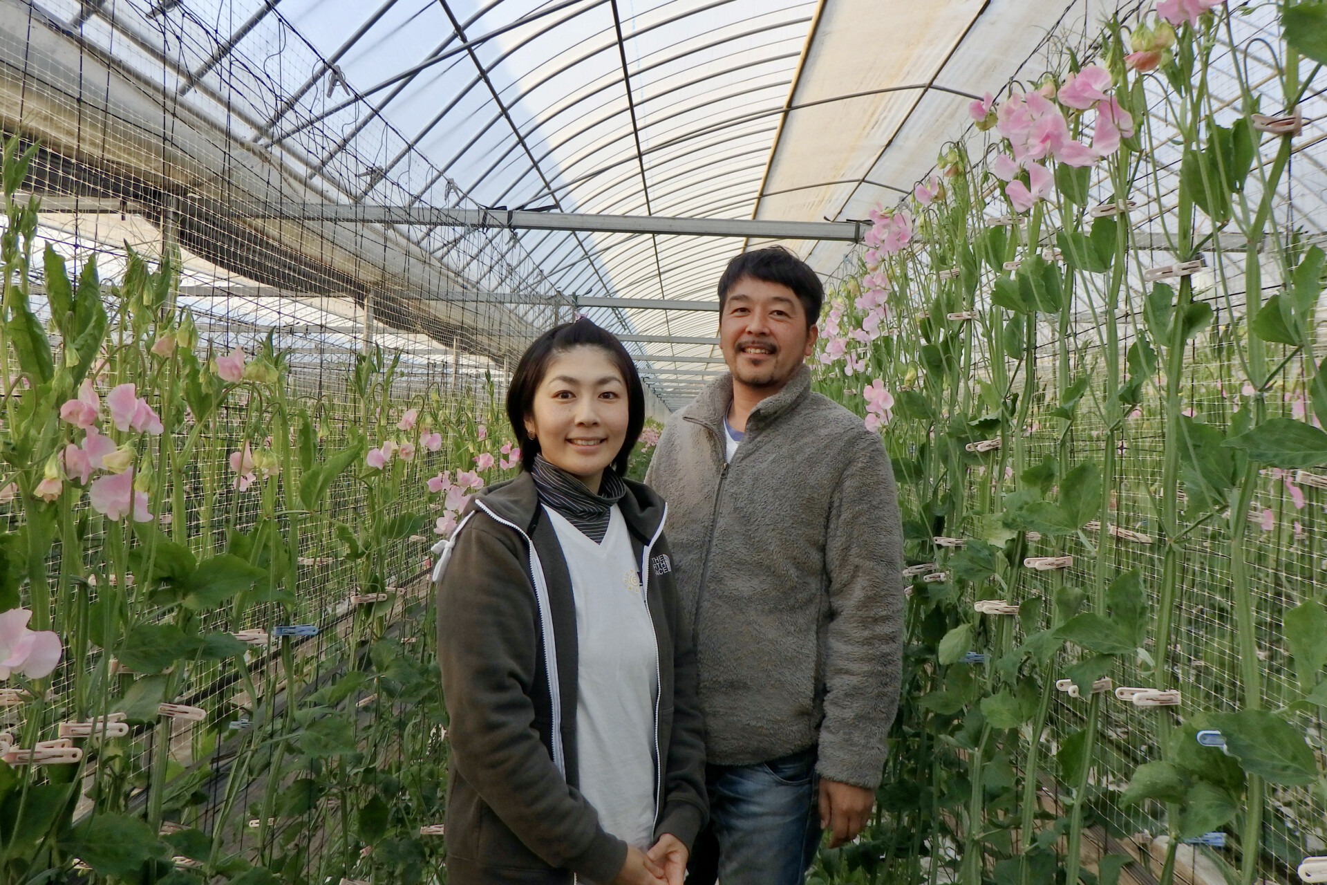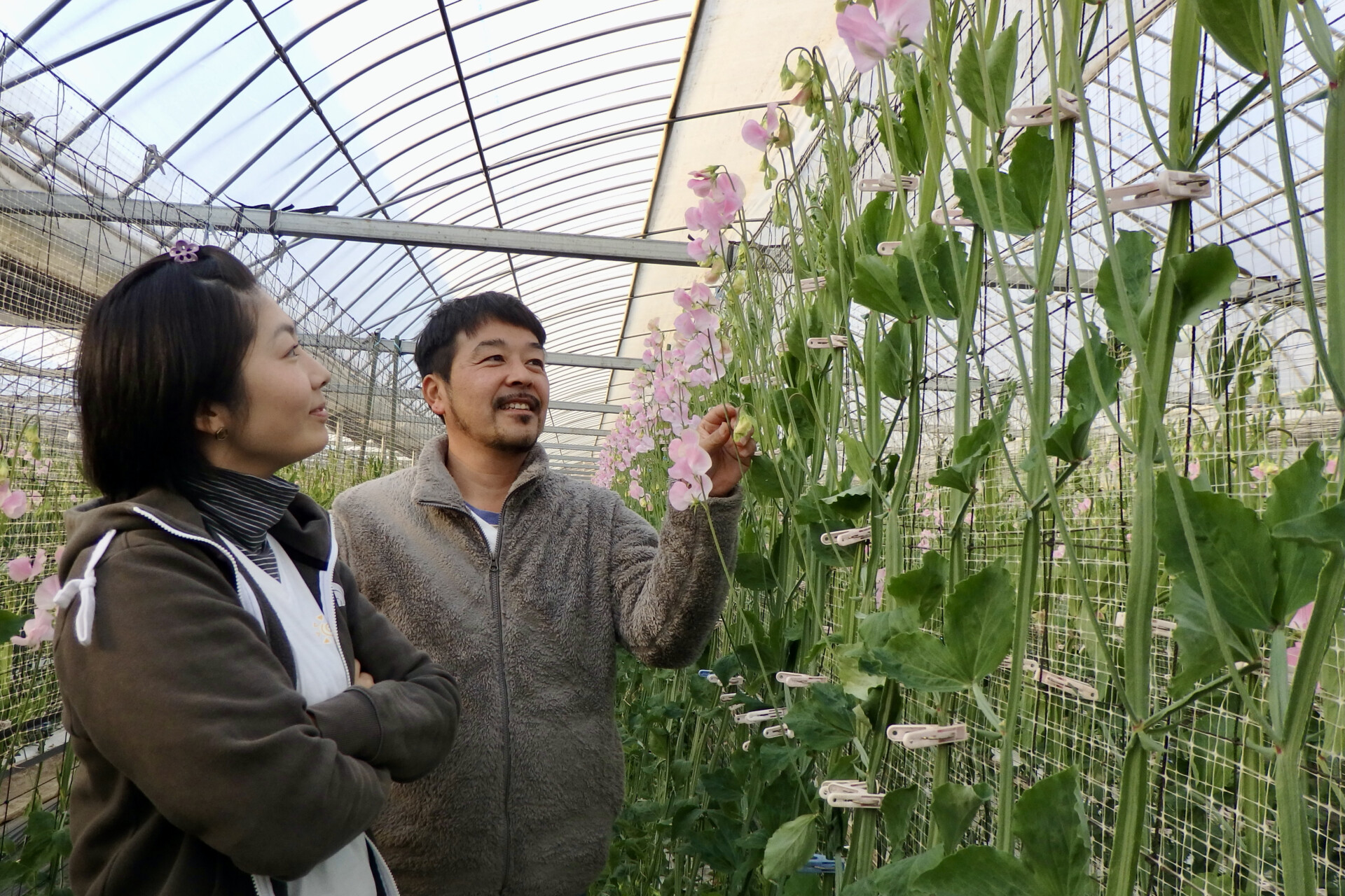 彰太さん「研修の2年を終えて3年目からは独立になります。豊後大野市のインキュベーションファームの特徴は、独立をするときの農地や住まいも自治体などが一緒に探してくれるところですね。他の地域では、研修が終わる年になっても自分の農地が見つかっていないという話を聞いたこともありました。当時のインキュベーションファーム研修生のほぼ全員が今も豊後大野市で僕たち夫婦のように農業をしています。その実績があってか、ここをモデルケースに大分県内各所で同じような取り組みが始まりました。杵築市の『杵築いちご学校』や、中津市の『中津市梨学校』などその地域に合った野菜・果物を育てています。ちなみに僕たちが育てているピーマンは、育ちやすく、値崩れしにくいんです。初期投資もそれほどかからないので、農業初心者でも始めやすく続けやすいのかなと思います。ピーマンのシーズン以外は、主にスイートピーを育てています」