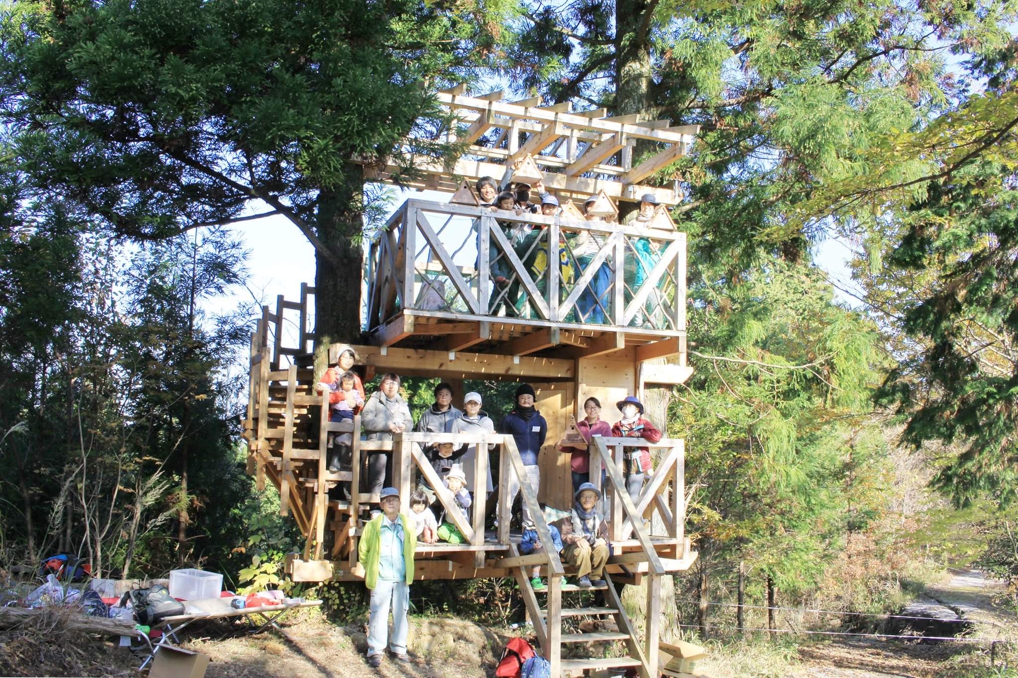 山を守るだけでなく、山を作るマルマタ林業では、15年ほど前から年に1回森林教室も行っています。始めたのはお母様で、山の麓にある地区に知人が移住したことがきっかけでした。元々山が当たり前に近くにある地元の方向けではなく、移住してきたり、山が近くにない方向けに行っているそうです。参加者の多くは知り合いや友人とのこと。そんな中、2年ほど前に東京の建築士さんと日田市の建築士さんと大工さんと共にツリーハウスを作りました。