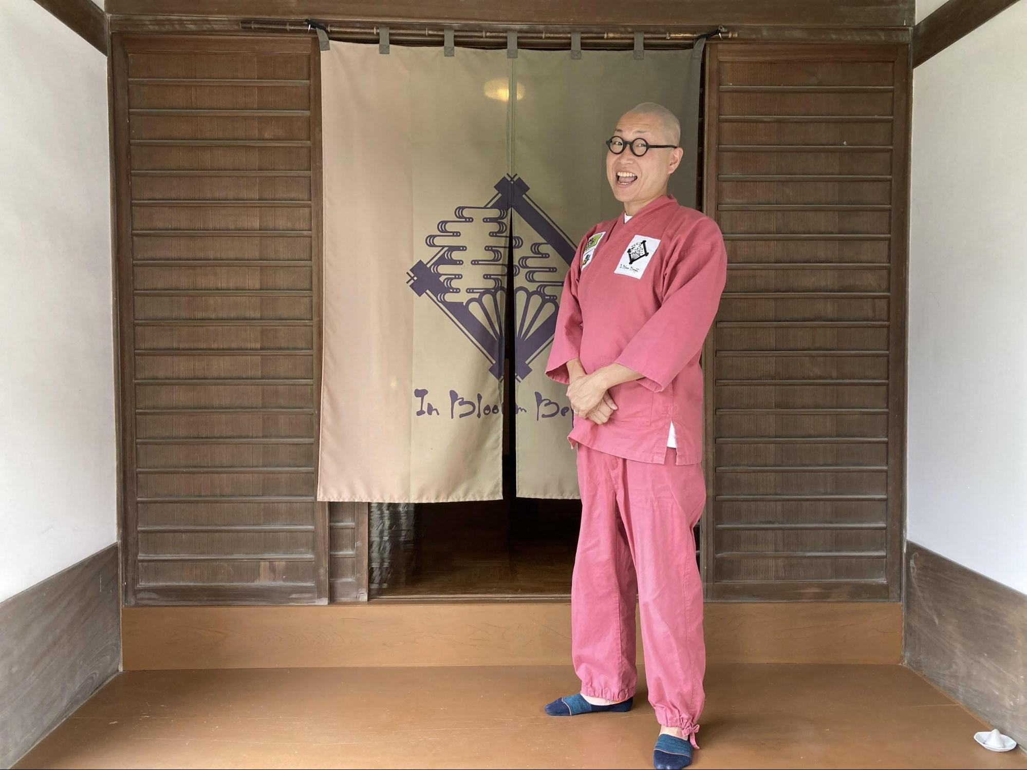 In Bloom Beppuの宿主である花田潤也さんは熊本出身ですが、無類の別府市好きで有名です。ピンクの作務衣に坊主頭ということもあり、地域の方からは親しみを込めて‘‘別府の一休さん‘‘と呼ばれています。