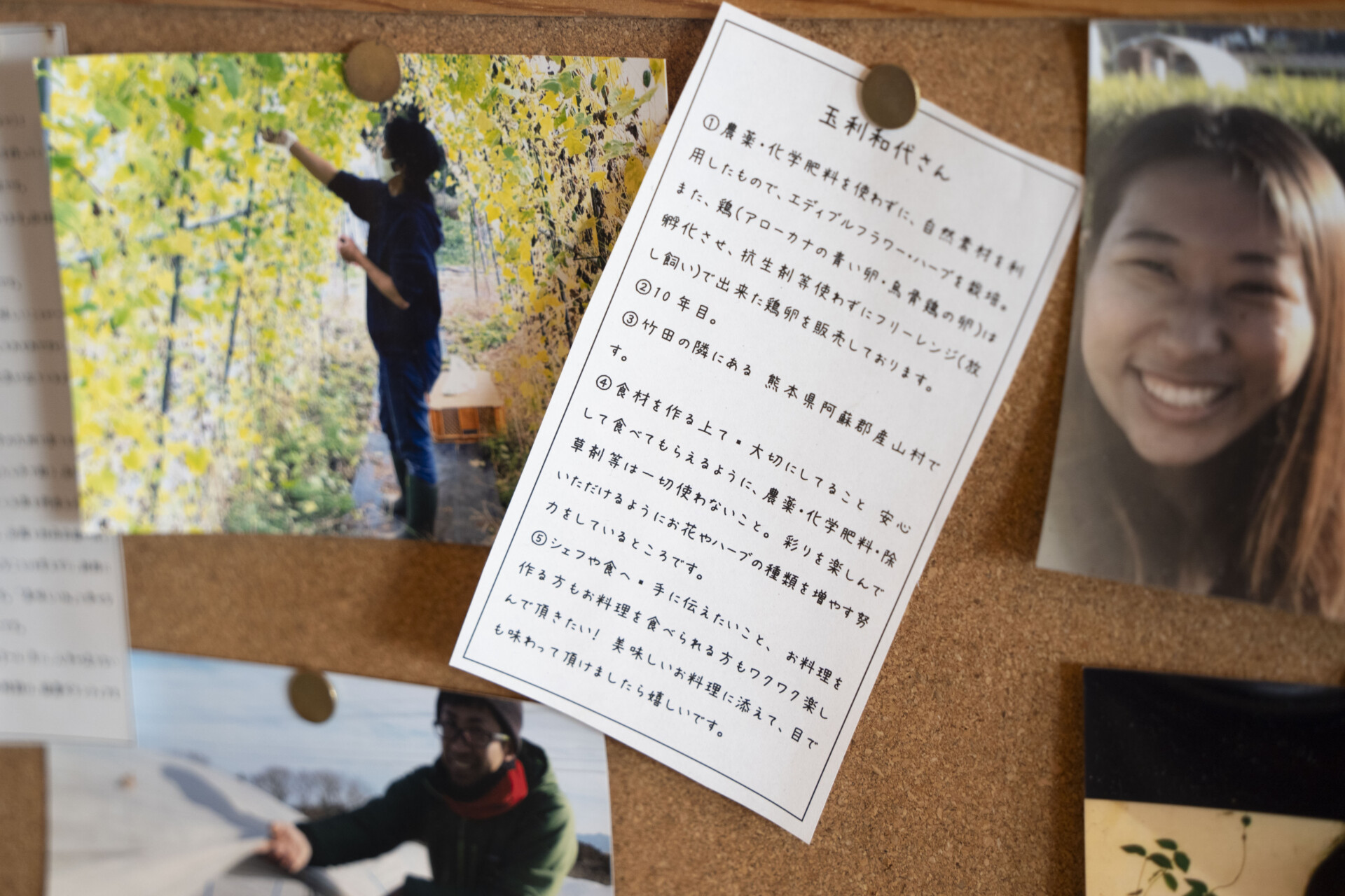 加えて、農家さんの写真や、どんな作物を育てているか、どんなことを大切にして育てているか、そしてお客さんへ伝えたいことなどをまとめたボードが用意されており、訪れた人は今食べている野菜をどんな人が育てたのかを知ることができるようになっています。
