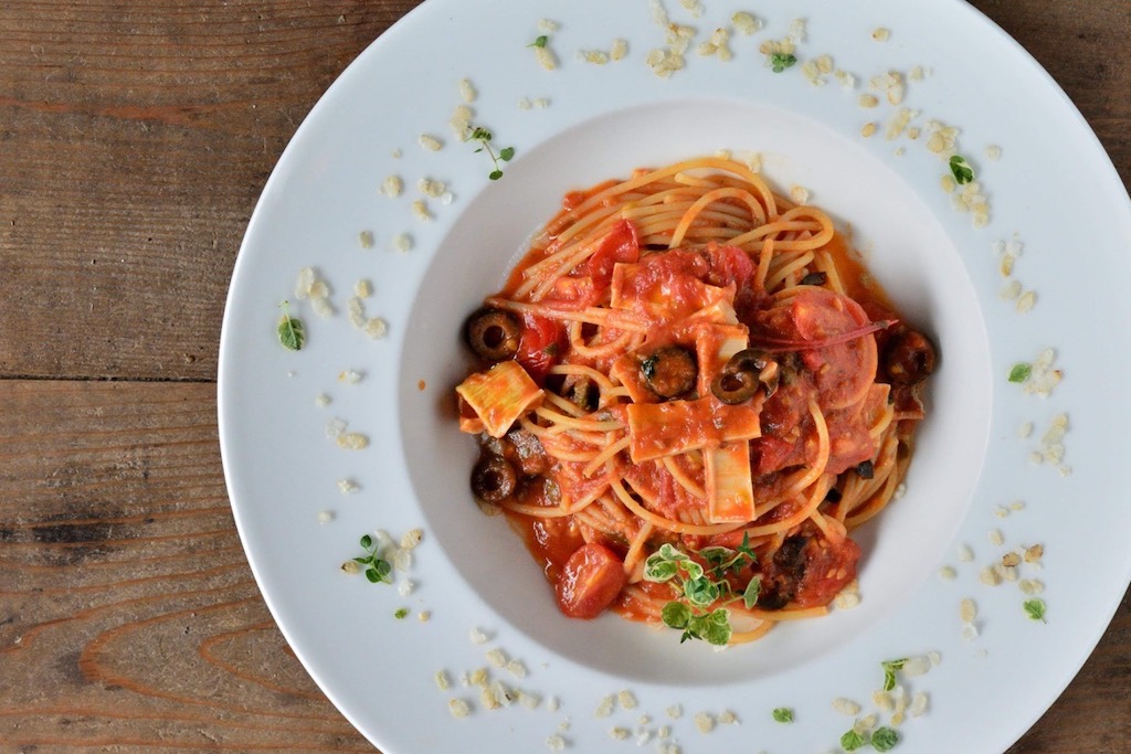 干したけのこと荻町のトマトを使ったトマトソースパスタ