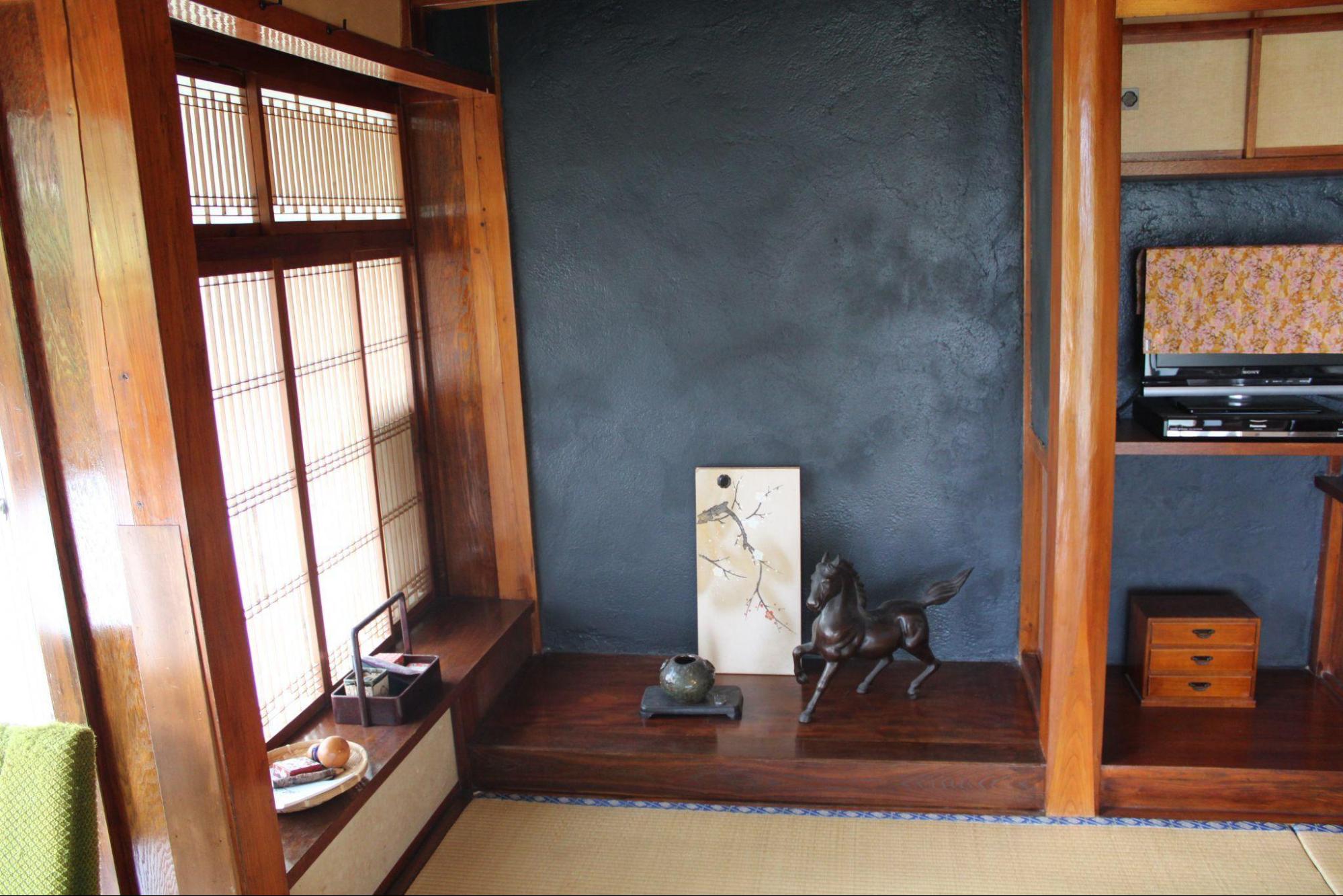 床の間の壁は漆喰に竹炭を練りこみ、青の顔料を足して青鈍色を再現