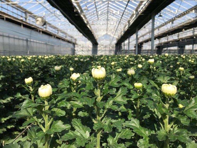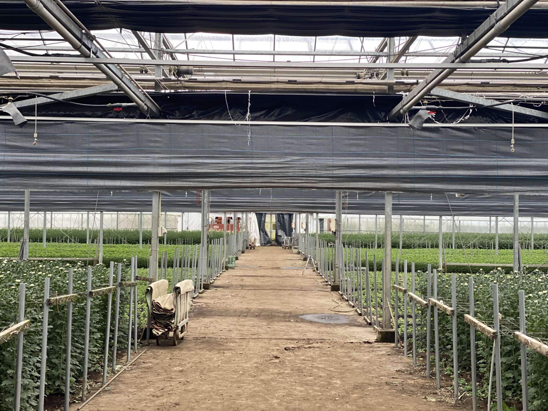 ▶︎菊を栽培している大規模ビニールハウスの内部