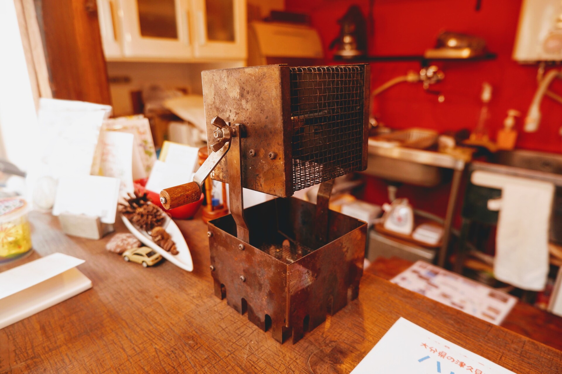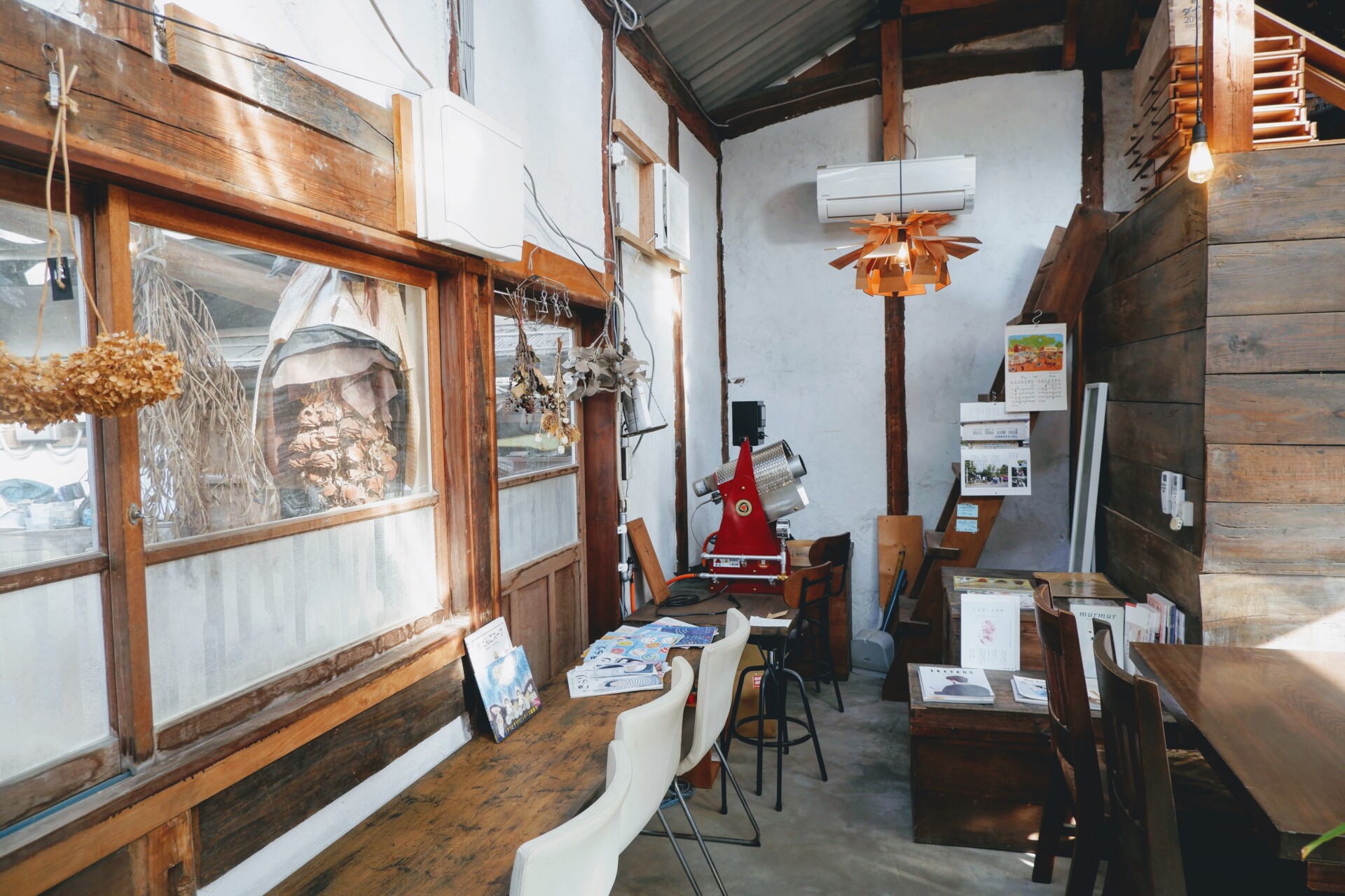 自らコツコツ改修したカフェ内装。コーヒー焙煎機も設置。