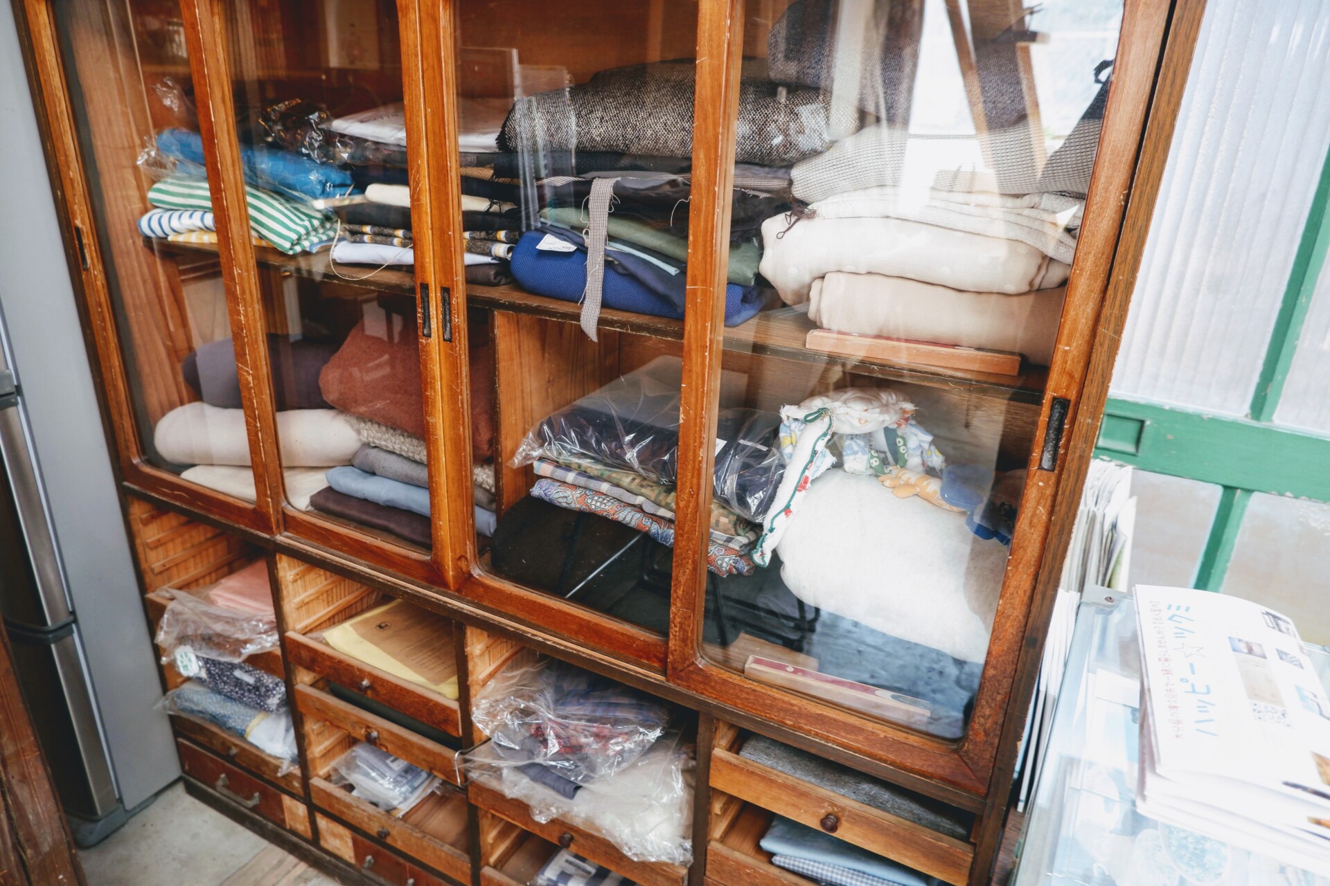 服や布が好きなあゆみさんが集めた布も販売中。