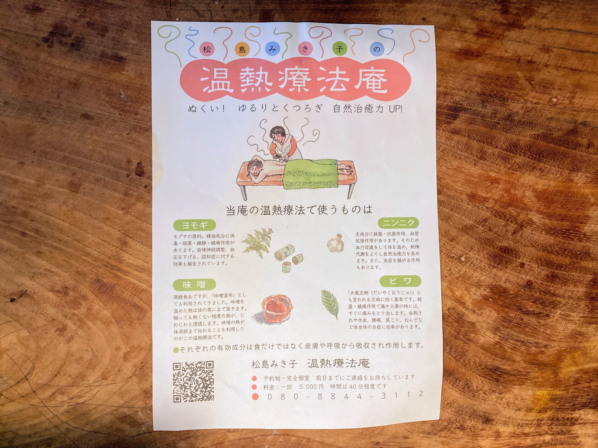ローカルルールに翻弄されながらも、先住していた移住者などに助けられながら、現在は自分のサイズを少しずつ見出して暮らしている松島さん。2016年に資格を取った温熱療法と、元々持っている管理栄養士の資格を活用し、移住前から個人向けに続けてきた「温熱療法庵」と近くのデイサービスで管理栄養士としての勤務が、現在の生業の中心です。