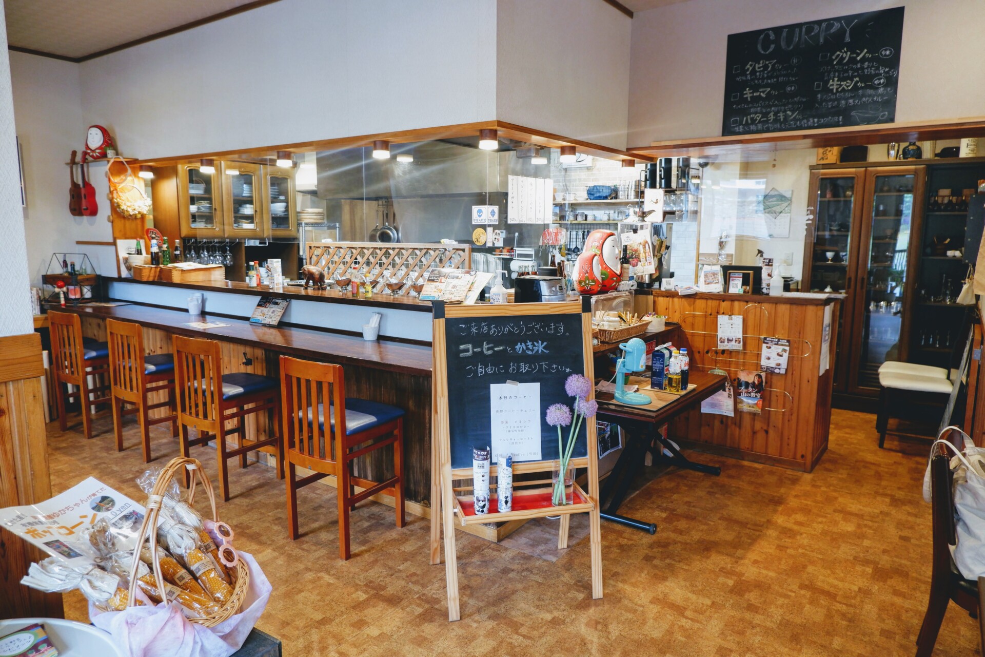 小出:自分の今の状況から、子連れでもゆっくり食事をする時間を楽しんでもらいたくて、開放感や明るさ、座席などにこだわりました。また、おむつ交換台や、キッズスペースを設けるなど、自分でも使いやすいと思える空間作りを意識しました。今は友人ともオンラインでも繋がれるのだけれど、同じ空間の中で安心できる場があるといいなと思っていました。コロナ禍でしたがオープンしてもうすぐ2年になります。今は地元で馴染みになって来てくれる方や、阿蘇久住に抜けていく道に面しているため、休日は観光の方達も立ち寄っていただいてます。当初の想定はファミリー層だったのですが、予想に反してご年配の方がお一人でお喋りにきて下さることが多く、介護の話からアイドル歌手の話や武勇伝まで世間話も楽しみの一つになりました。
