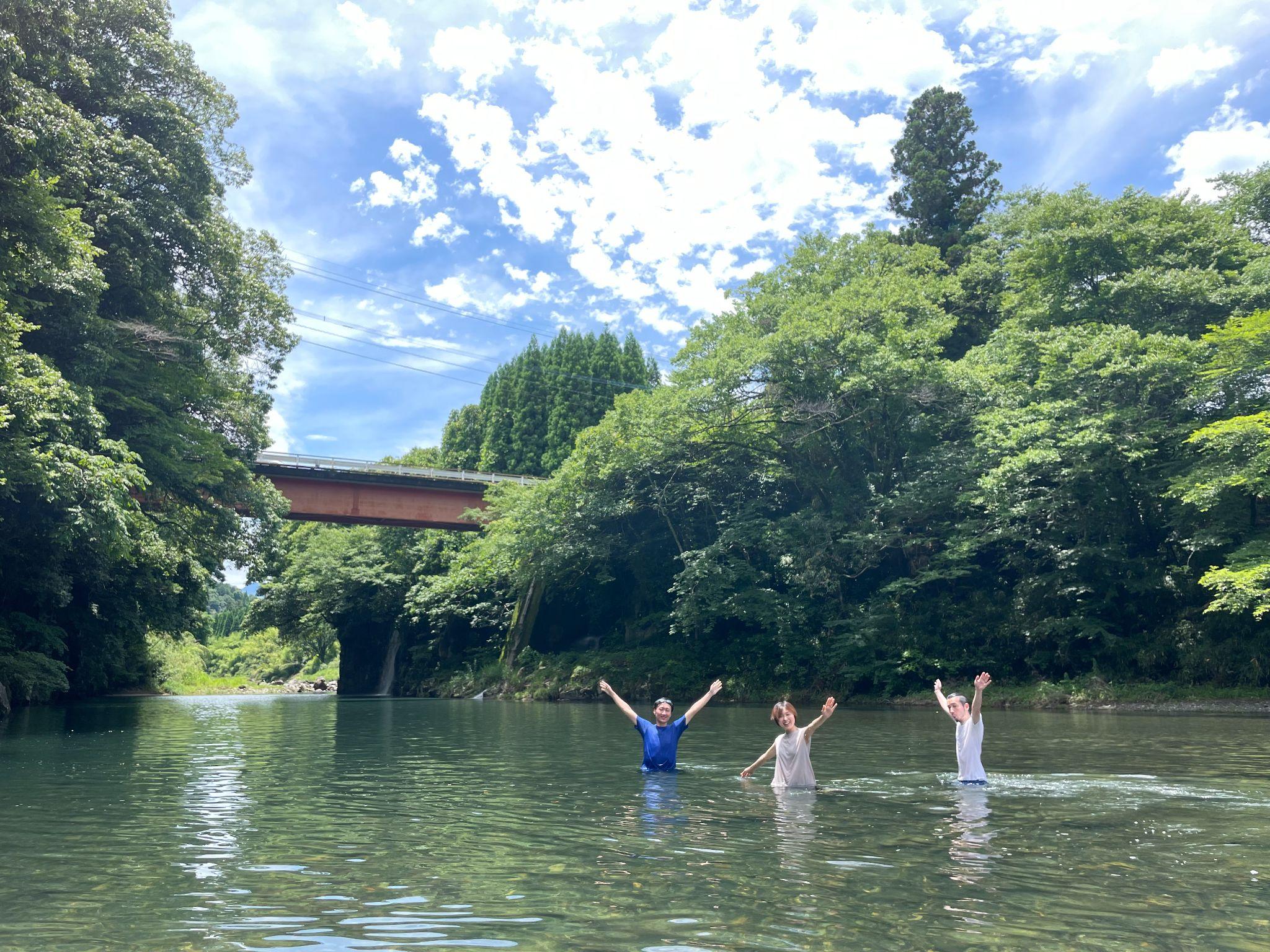 大分県を訪れたキッチハイクの上司と豊後大野市の川で遊ぶ青木さん