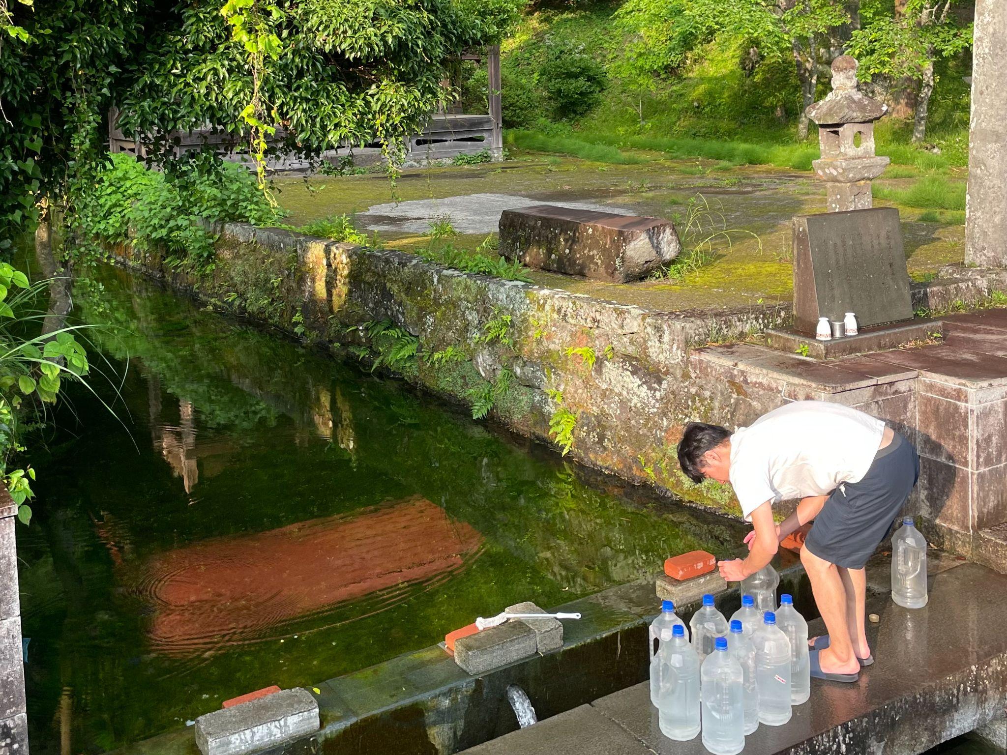 老野湧水で湧き水を汲む青木さん(IKIで使用する飲水)