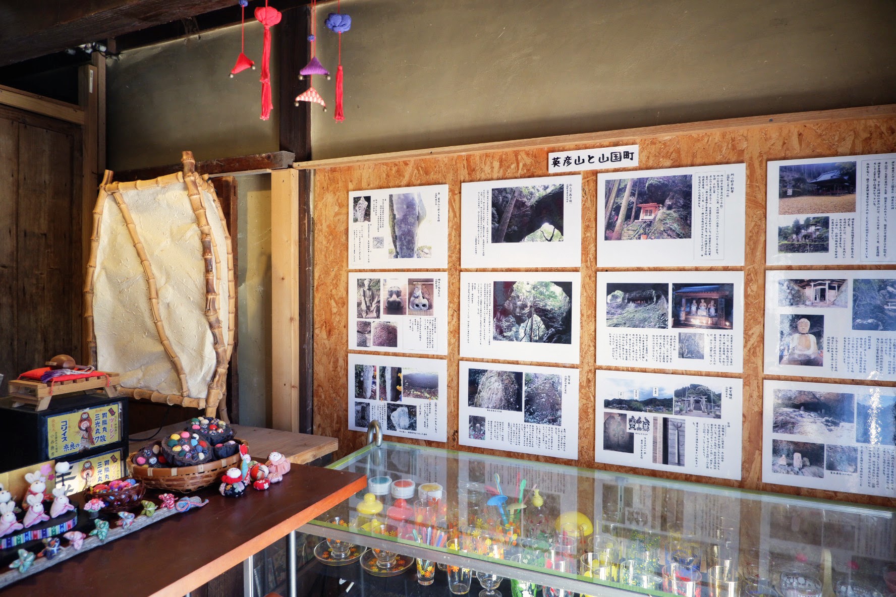 玄関に英彦山や山国町の歴史資料を展示。