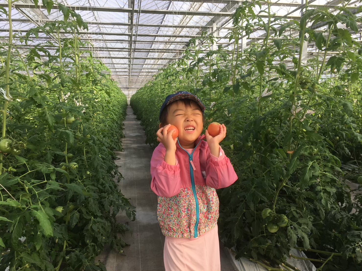 エコファーム21でトマトを持つ高橋さんの長女(当時3歳)
