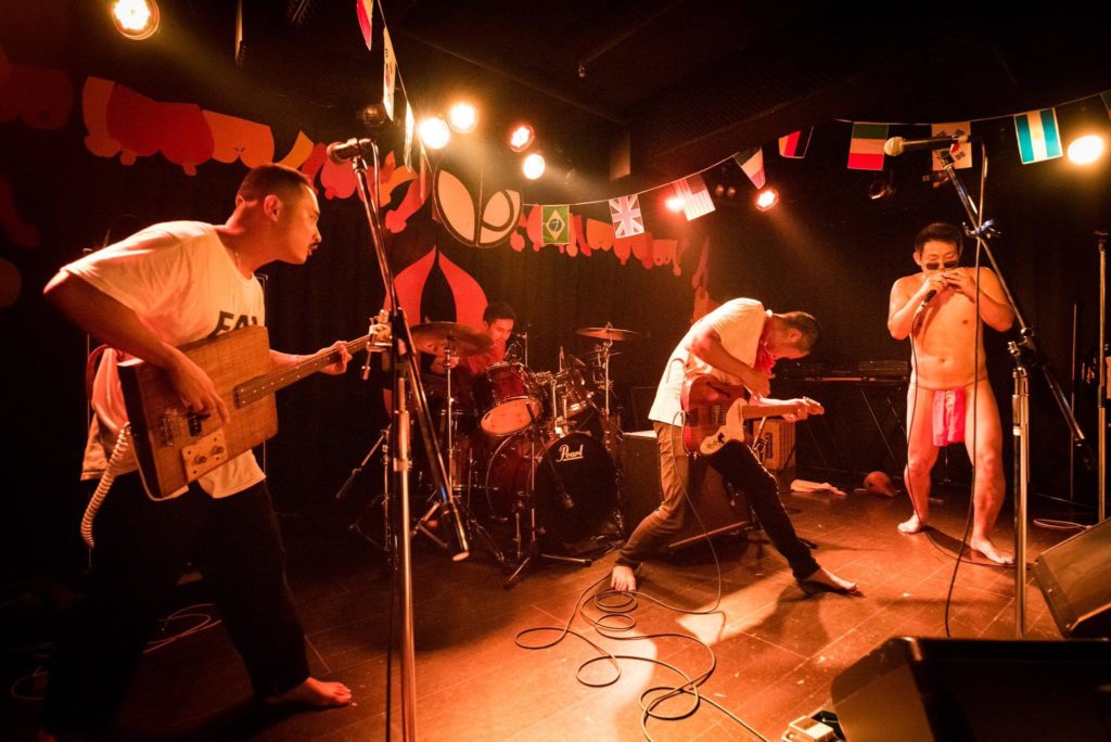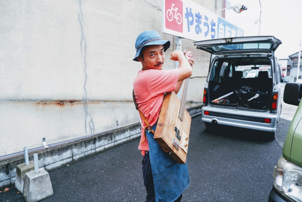 「中学校の時、少しだけベースは触ったことはあったけどほぼ素人です。サイキシミンは元々あったバンドで、移住して半年くらいの時に1回解散したんです。(大谷さん記事参照)何回かライブをみたけど良いバンドで、もったいないなあと思っていたら1-2ヶ月後に大谷さんに声をかけてもらって、4人でやろうということになったんです。とはいえベースも持ってなくて、大谷さんが将棋盤をもらってきたので、それにネックをつけてベースにしたんです。めちゃくちゃ重いけど良い音鳴るんですよ。」