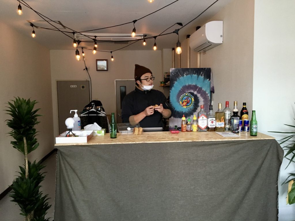 今後は変わらずバンド活動と自転車屋を続けていく中で、今年度中には立ち飲み屋をやりたいねと話していたところ、なんとついに開店。その名も「New Mexico PERA PERA」。場所は工藤さんの事務所の一画(ほぼ全部)を使い、大工で培った技術を活かして金井さんがバーカウンターなどを作成。まずは手軽にと季節仕様で開業したそうです。料理が比較的上手なシェアメイトのトミーさんがバーに立ち、基本的にはドネーション方式*、フードは持ち込みOKの気軽な立ち飲み屋です。