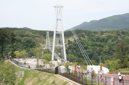 筑後川源流域にあたる、鳴子川渓谷の標高777m地点に架かる長さ390m、川床からの高さ173mでともに日本一の規模を誇る日本一の人道専用吊橋。橋の上からは日本の滝百選に選ばれた震動の滝の雄滝や雌滝を見ることができます。